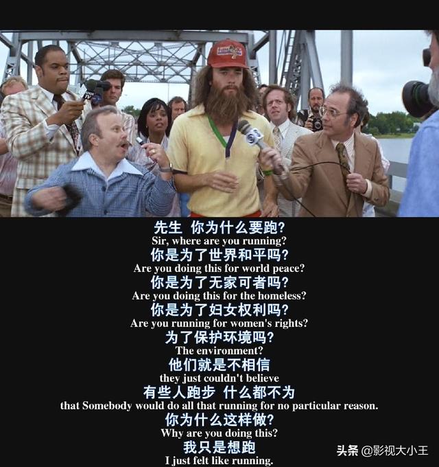 ①影片故事是由“阿甘向等车路人的倾诉中”开始回忆的。他的倾诉对象换了一个又一个,有人笑他荒谬、有人匆匆离去、有人听了一会也离开了……