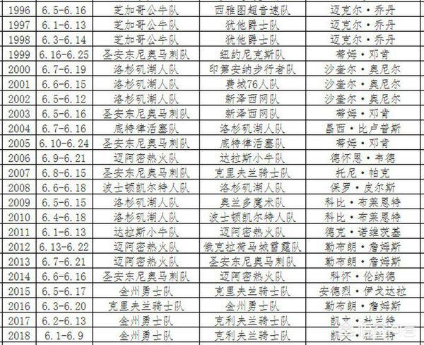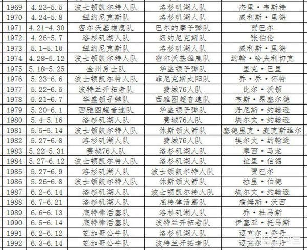 1994-1995 休斯顿火箭队 4:0 奥兰多魔术队1993-1994 休斯顿火箭队 4:3 纽约尼克斯队1992-1993 芝加哥公牛队 4:2 菲尼克斯太阳队1991-1992 芝加哥公牛队 4:2 波特兰开拓者队1990-1991 芝加哥公牛队 4:1 洛杉矶湖人队1989-1990 底特律活塞队 4:1 波特兰开拓者队1988-1989 底特律活塞队 4:0 洛杉矶湖人队1987-1988 洛杉矶湖人队 4:3 底特律活塞队1986-1987 洛杉矶湖人队 4:2 波士顿凯尔特人队1985-1986 波士顿凯尔特人队 4:2 休斯顿火箭队1984-1985 洛杉矶湖人队 4:2 波士顿凯尔特人队1983-1984 波士顿凯尔特人队 4:3 洛杉矶湖人队1982-1983 费城76人队 4:0 洛杉矶湖人队1981-1982 洛杉矶湖人队 4:2 费城76人队1980-1981 波士顿凯尔特人队 4:2 休斯顿火箭队1979-1980 洛杉矶湖人队 4:2 费城76人队1978-1979 西雅图超音速队 4:1 华盛顿子弹队