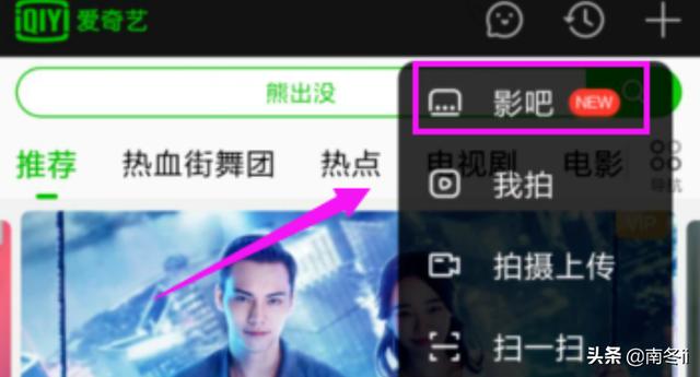 1、下载并且安装爱奇艺app,打开后点击右上角的加号打开功能菜单,弹出功能菜单后点击进入影吧。